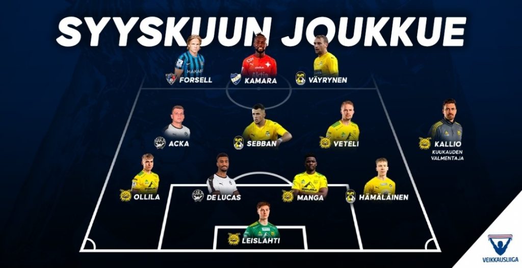 Kuukauden joukkueeseen nimettiin päävalmentaja Kallion ohella neljä pelaajaa Ilveksestä. Kolme pelaajaa nimettiin sarjataulukon kärkeen syyskuussa nousseesta KuPS:sta, kaksi FC Hakasta sekä yksi FC Interistä sekä HIFK:sta.