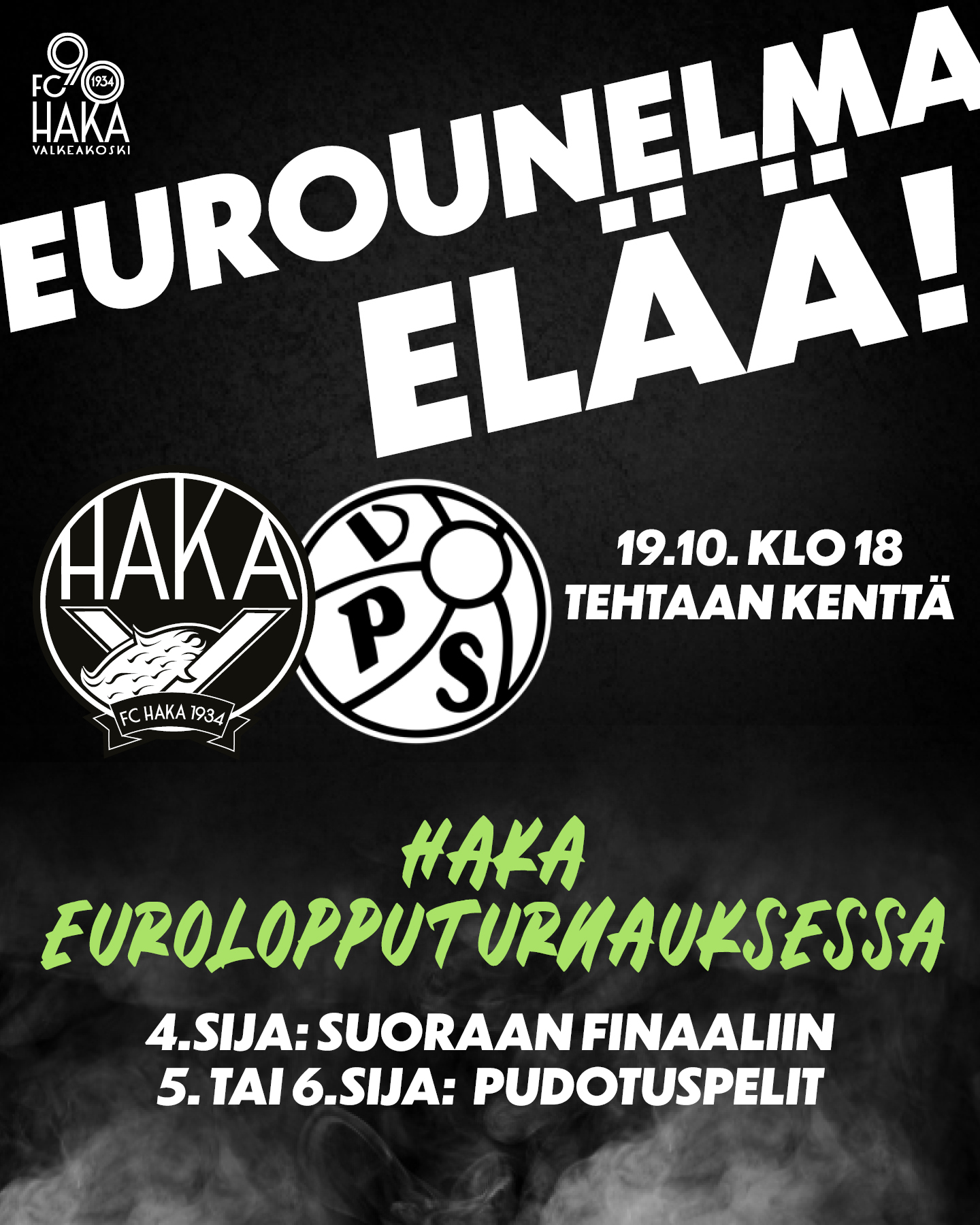 Lauantaina Hakalla on pelissä valtava panos: suora paikka Eurolopputurnauksen finaaliin! Finaalipaikan saa Veikkausliigan neljännen sijan varmistanut joukkue – tästä sijoituksesta kamppailevat Haka ja SJK. Tällä hetkellä sarjataulukossa SJK on vain kahden pisteen päässä ja joutuvat taistelemaan voitosta tai tasapelistä kynsin ja hampain, kun vastaan asettuu mestaruudesta taisteleva Ilves.