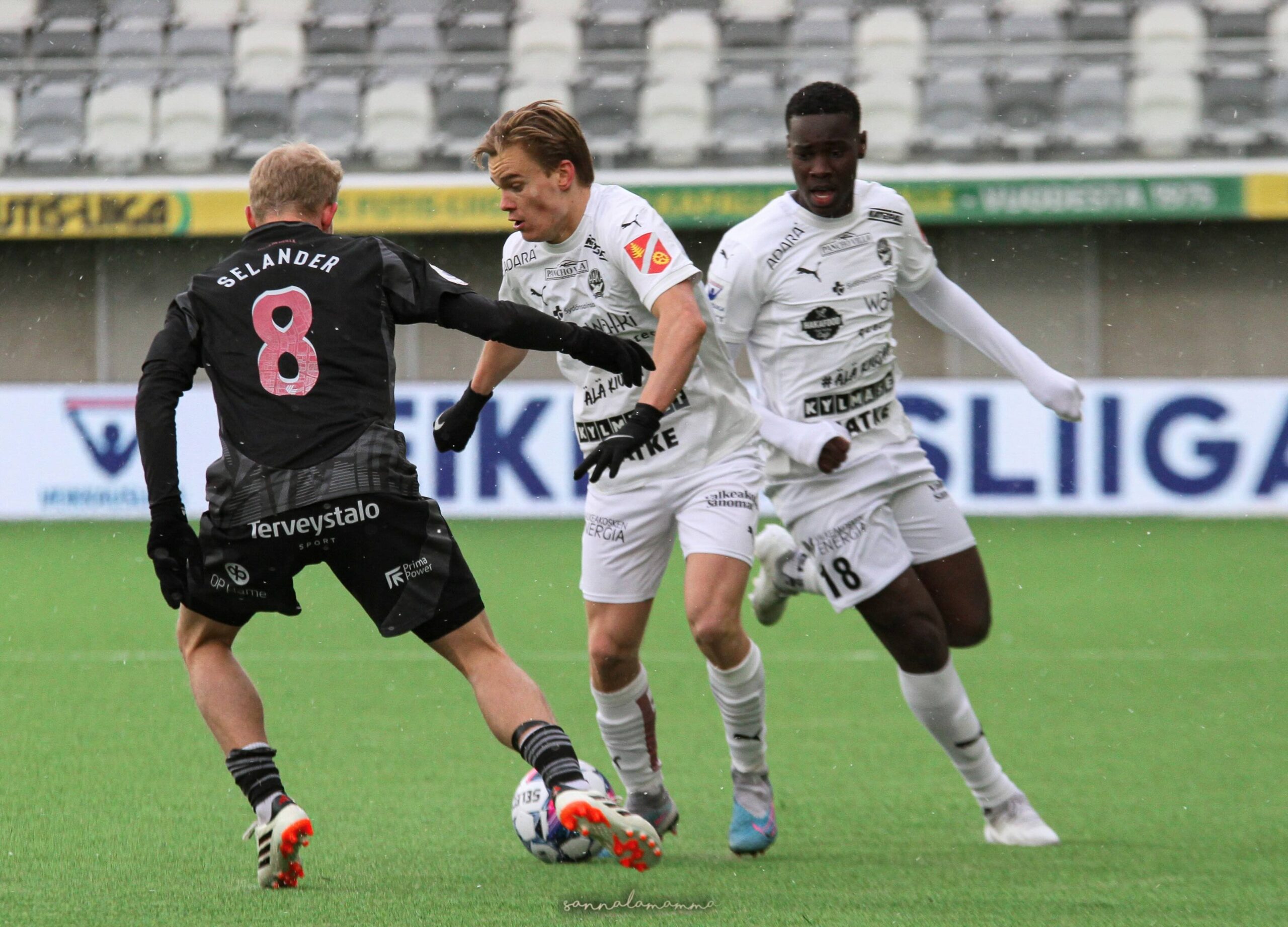 Ottelun ensimmäinen jakso oli Hakalta varmaa, oman pään kautta pelaamista ja prässipelaaminenkin oli hivenen passiivista. Pääasiassa vastahyökkäyksillä iskeneen koskilaisjoukkueen taktiikka kuitenkin puri ja ensimmäinen huippupaikka avausmaaliin syntyi 23. minuutilla, kun Marko Bacanin pääsi muutamasta metristä yrittämään maalintekoa Elias Mastokankaan loistotarjoilusta. Hyökkääjän laukaus osui kuitenkin suoraan päin maalivahti Joshua Oluwayemia ja näin lukemat pysyivät vielä maalittomina.