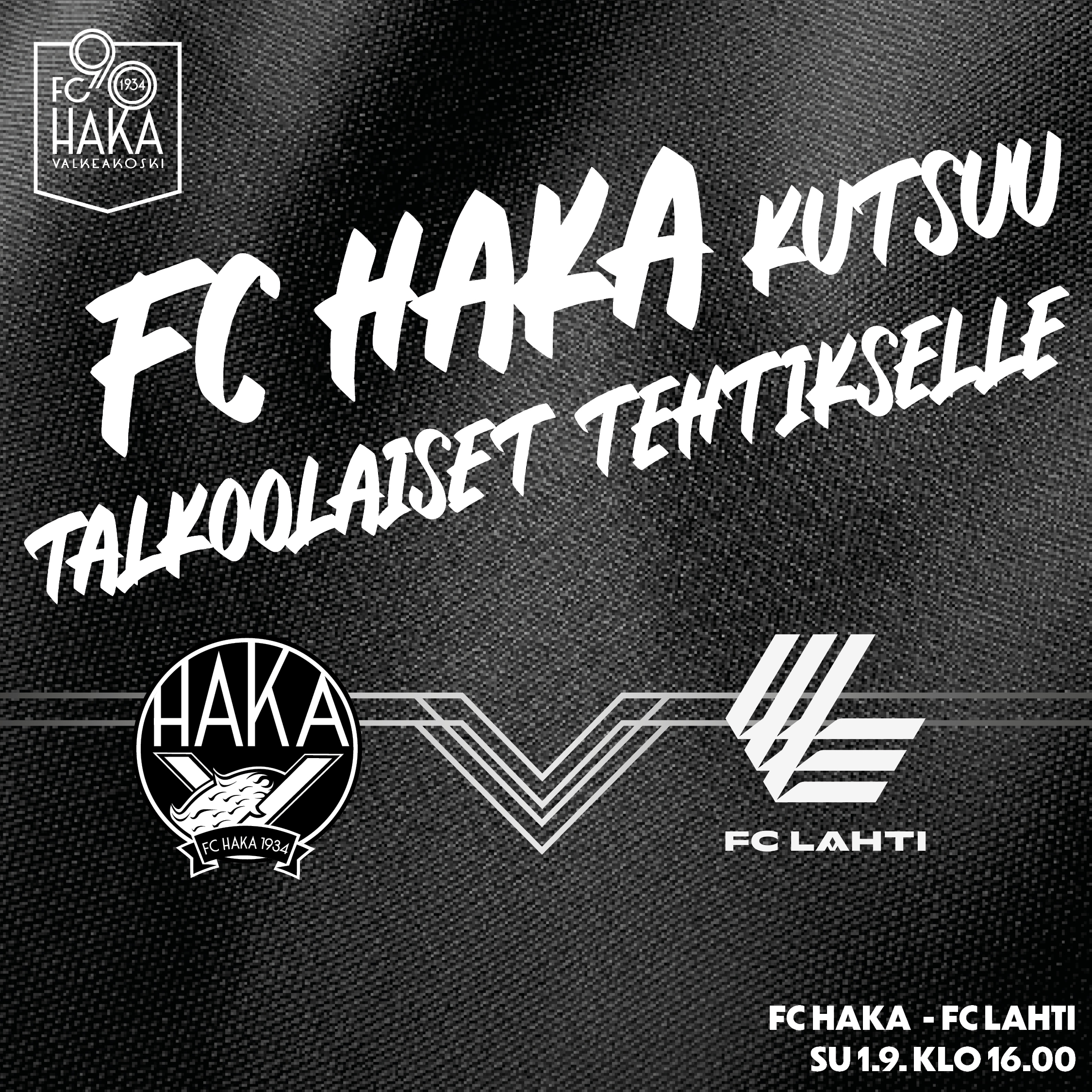 FC Haka kutsuu kaikki FC Hakan entiset talkoolaiset seuraamaan 90-vuotisjuhlan hengessä ottelua FC Haka – FC Lahti sunnuntaina 1.9.2024. Arvostamme seuran eteen tehtyä työtä koko 90-vuotisen historian aikana, ja kutsu otteluun on kiitoksemme teille, ketkä ovat työskennelleet vaikkapa tilastoinnissa, lipunmyynnissä, järjestyksenvalvojana tai jossakin muussa roolissa!
