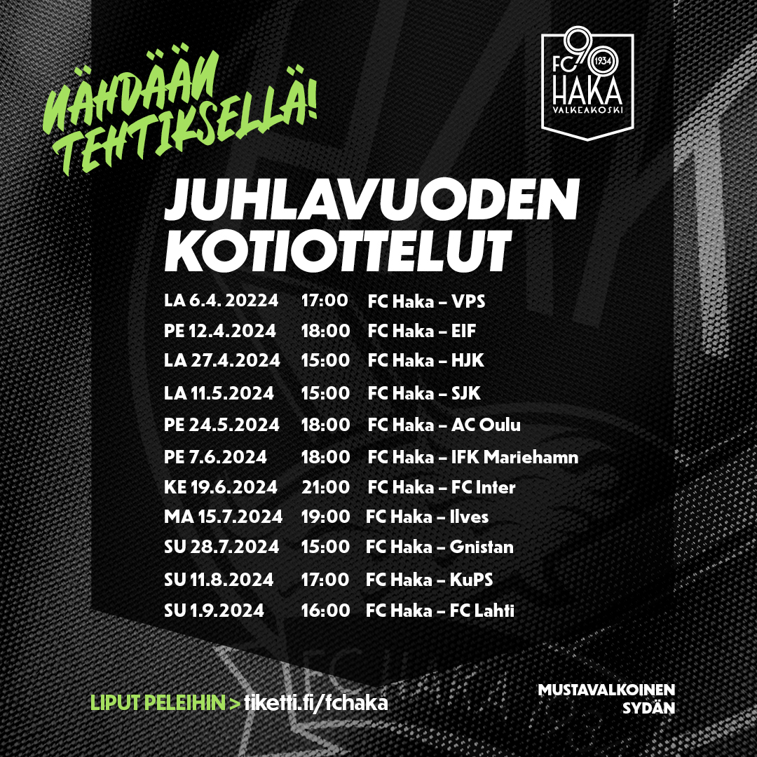 Juhlavuoden humuun päästään jo ensi viikon lauantaina 6.4. klo 17.00 alkavassa ottelussa, jossa vastassa on myös omaa juhlavuottaan viettävä Vaasan Palloseura. 90-vuotiaan Hakan ja 100-vuotiaan VPS:n kohtaaminen potkaisee käyntiin Tehtiksen tapahtumarikkaan kauden, jonka aikana juhlitaan Hakan historiaa ja tulevaisuutta, vietetään aikaa yhdessä – parhaassa seurassa!