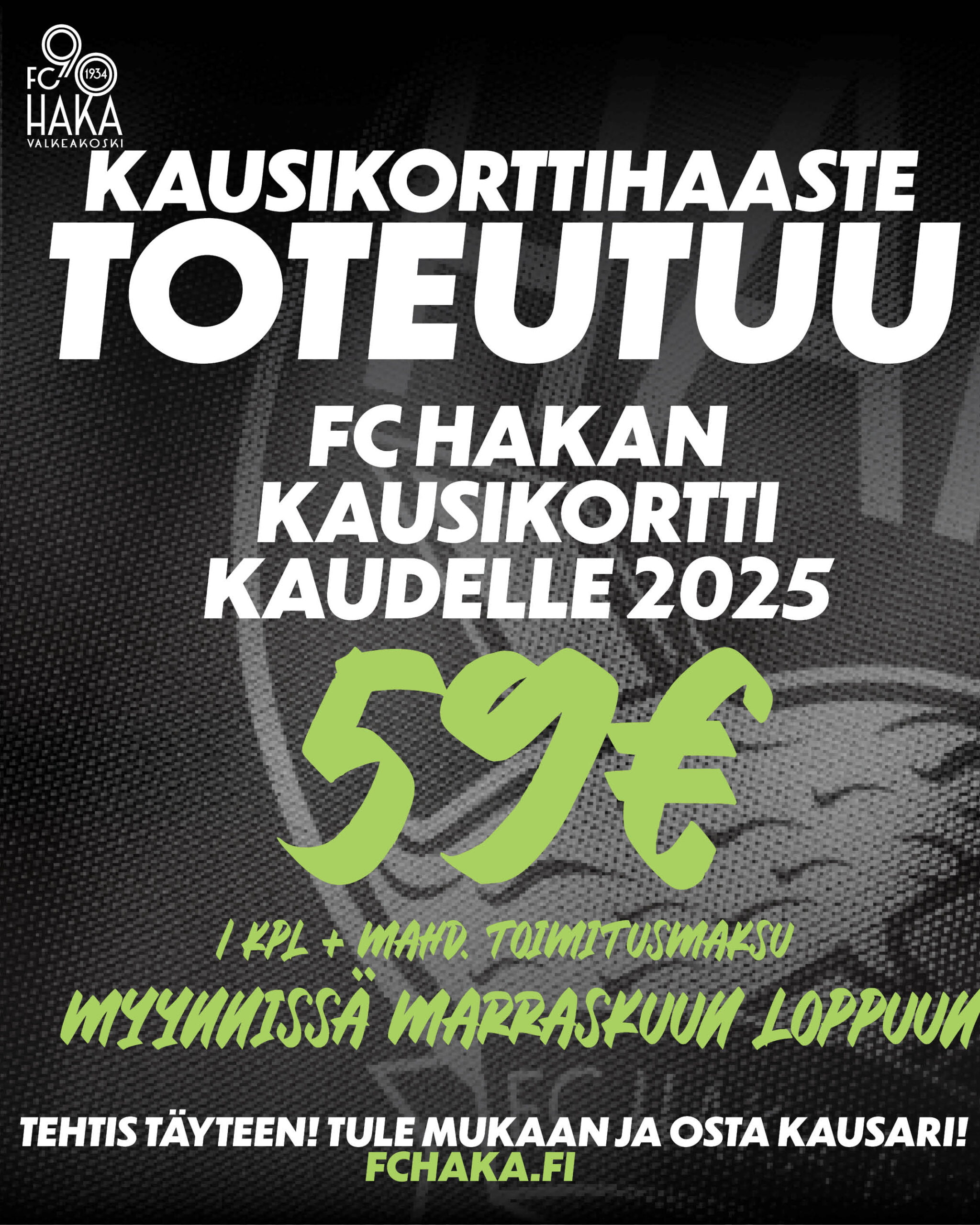 FC Hakan kausikorttihaaste on saanut mielettömän hienon vastaanoton. Kampanja on päätetty toteuttaa ja kausikortin saa nyt 59€/kpl hinnalla, vaikka tavoite 3200 varausta ei vielä ihan tullutkaan täyteen. Jotta kaikki halukkaat saavat ensi kaudelle varmasti Hakan superedullisen kausikortin, kausikortin ostaminen 59€/kpl hinnalla on mahdollista vielä marraskuun loppuun saakka. Tukirenkaan kausikortin saa 209€/kpl hintaan saman ajan.