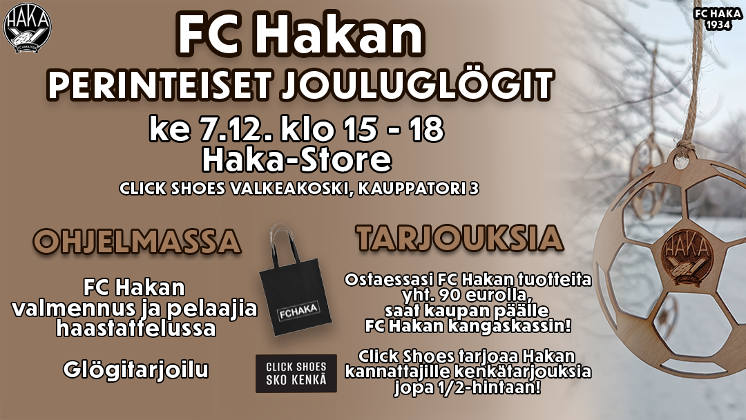 FC Hakan perinteiset jouluglögit järjestetään keskiviikkona 7.12. klo 15:00 – 18:00 uudessa fanituotemyymälässä Haka-Storessa. Haka-Storen löydät Valkeakosken Click Shoesin myymälästä Valkeakosken keskeisimmällä sijainnilla (osoitteessa Kauppakatu 3).