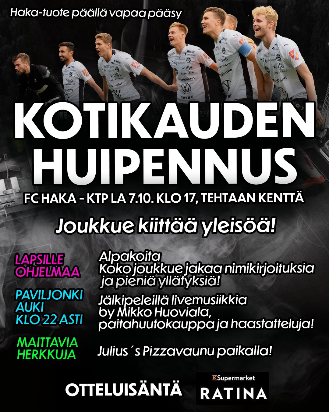 FC Haka saa kauden viimeiseen kotiotteluun vastaansa sarjapaikastaan taistelevan KTP:n Kotkasta.