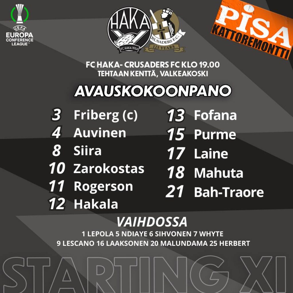 FC Haka ja Crusaders FC kohtasivat torstai -illassa Konferenssiliigan ensimmäisen karsintakierroksen ensimmäisessä osaottelussa Tehtaan kentällä torstaina. Maalirikkaassa ja vaiherikkaassa ottelussa ei saatu joukkueiden välistä paremmuutta ratkaistua, vaan ratkaisevaan toiseen osaotteluun lähdetään 2-2 -tasatuloksella.