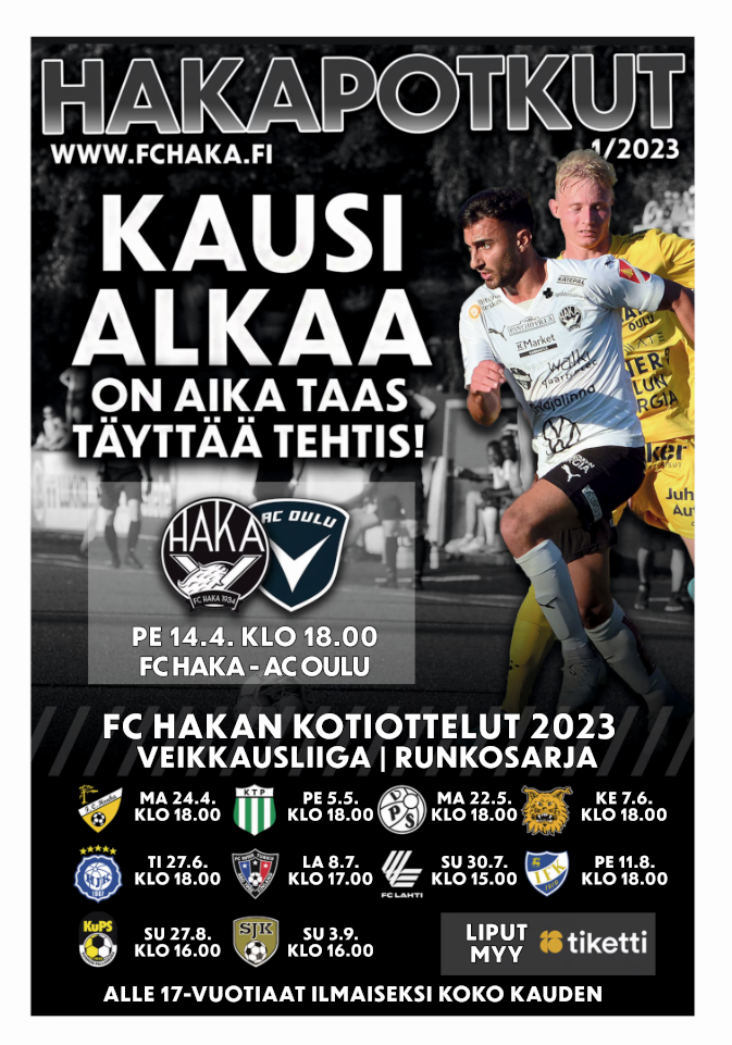 Mielenkiintoinen lukupaketti ilmestynyt huomista kotiavausottelua odotellessa – FC Hakan oma, kahdesti vuodessa ilmestyvä Hakapotkut, ilmestyi tänään! Tuore liite pitää sisällään muun muassa puheenjohtaja Marko Laaksosen terveiset, ennakointia kesän tulevista euro-otteluista, unohtamatta perinteisiä pelaajaesittelyitä.