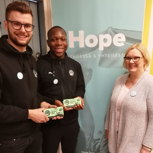 Keskiviikkona FC Hakan pelaajista Henri Malundama ja Niklas Friberg vierailivat Hope ry:llä Tampereella viemässä lahjoitetut liput ja tutustumassa toimintaan. Pelaajat pääsivät myös lajittelemaan lahjoitettuja vaatteita. Viime vuonna Miesten Ykkösen seurat järjestivät hyväntekeväisyysotteluita, joissa kerättiin liikuntavälineitä Hopelle, joten oli luontevaa jatkaa yhteistyötä.