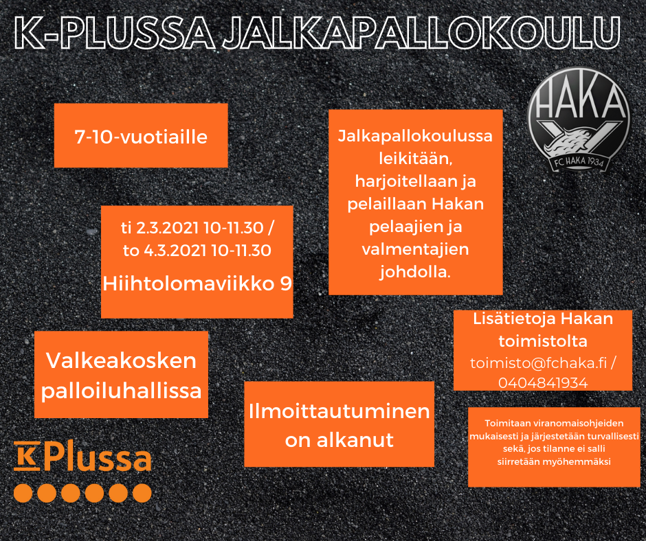 K-Plussa ja FC Haka järjestävät yhteistyössä ilmaisen jalkapallokoulun 7-10-vuotiaille lapsille. Jalkapallokoulussa leikitään, harjoitellaan ja pelaillaan Hakan pelaajien ja valmentajien johdolla. Tervetulleita ovat kaikki kiinnostuneet 7-10-vuotiaat. Jalkapallokoulu järjestetään viikolla 9 ti 2.3.2021 ja to 4.3.2021, joka on Pirkanmaalla myös hiihtolomaviikko, Valkeakoskella Palloiluhallissa. Jalkapallokouluun on mahdollisuus osallistua yhtenä päivänä.