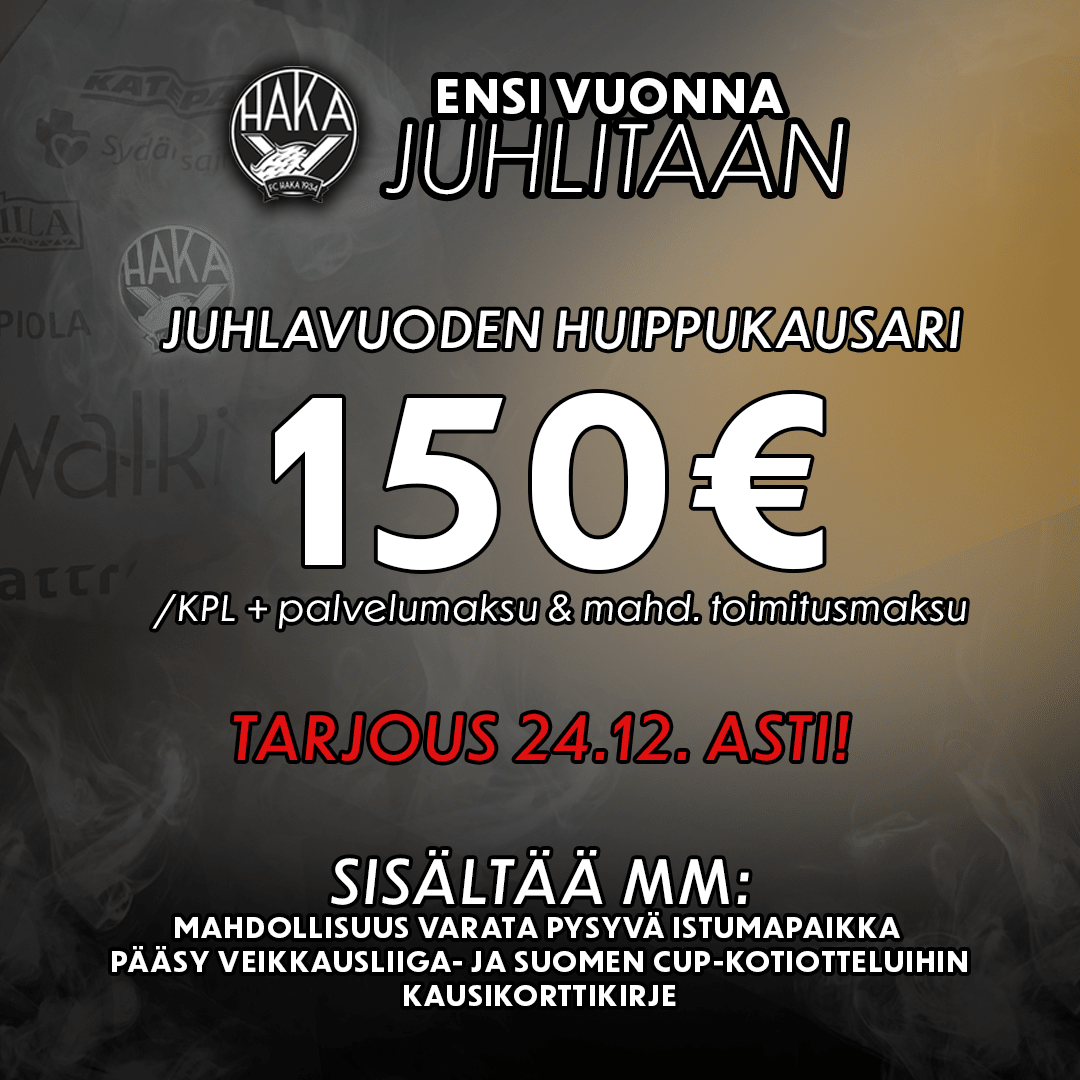 Jouluun asti aikaa ostaa edullisella kampanjahinnalla 150€ Veikkausliigakausari 2024! Hinta sisältää mahdollisuuden varata tietty numeroitu istumapaikka koko kaudeksi.