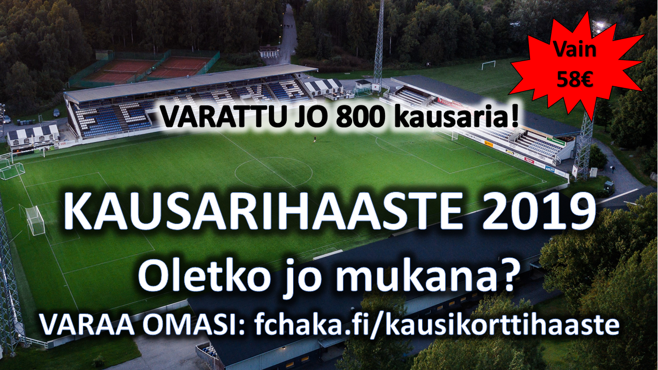 FC Hakan kausi päättyi viime lauantaina Ykkösen viidenteen sijaan, joka tarkoittaa että Haka saa tulevalle kaudelle 14 kotiottelua. Kausikorttihaasteen 58 euron kausarilla pääsee siis 14 kotiotteluun, jolloin yhden ottelun hinnaksi tulee noin 4,14 euroa! Kausikortteja on varattu tällä hetkellä noin 800 kappaletta. Kausikortin voi ostaa 58 euron hinnalla, jos perustamisvuotta 1934 vastaava määrä kortteja varataan ennen marraskuun loppua.