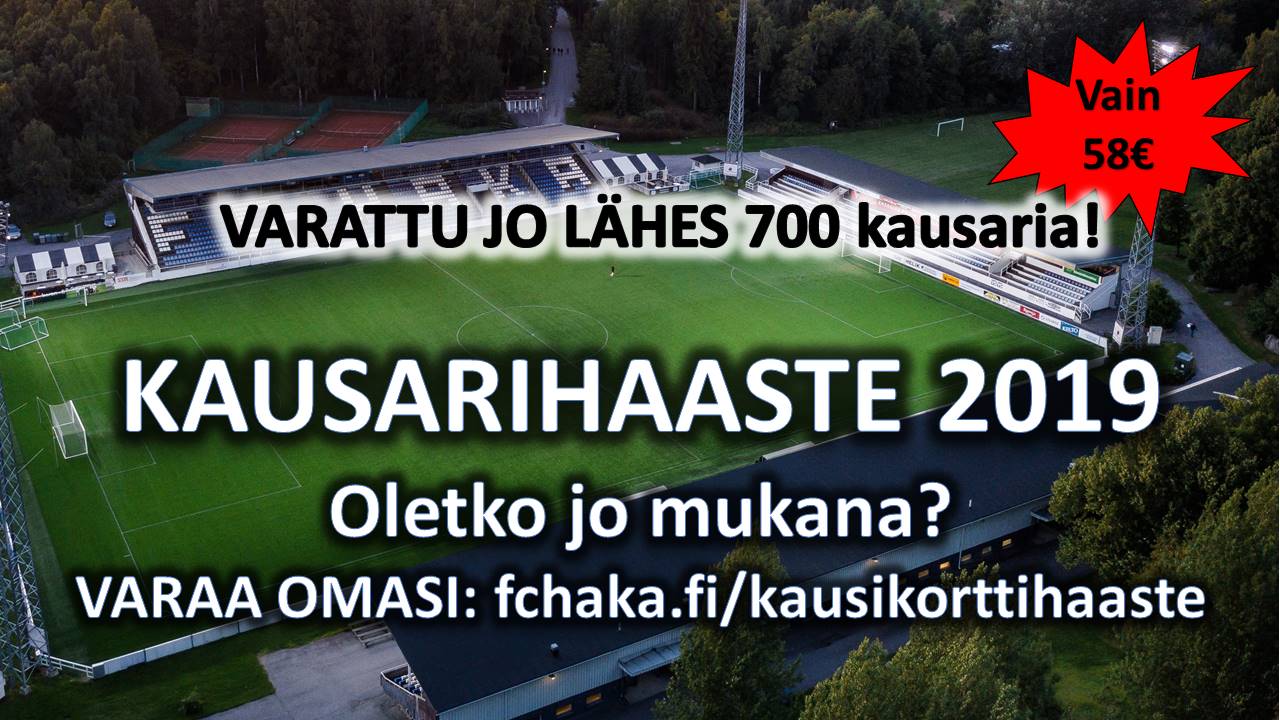 FC Haka aloitti lokakuun alussa kausikorttihaasteen kaudelle 2019. Haasteen tavoitteena on myydä vähintään seuran perustamisvuoden mukainen määrä, eli 1934 kappaletta ensi kauden kausikortteja seuran 85 vuoden iästä mukailtuun 58 euron kappalehintaan. Jos siis pääsee Hakan jokaiseen kotiotteluun kaudella 2019, muodostuu yhden ottelun sisäänpääsyn hinnaksi vain hieman reilut neljä euroa.