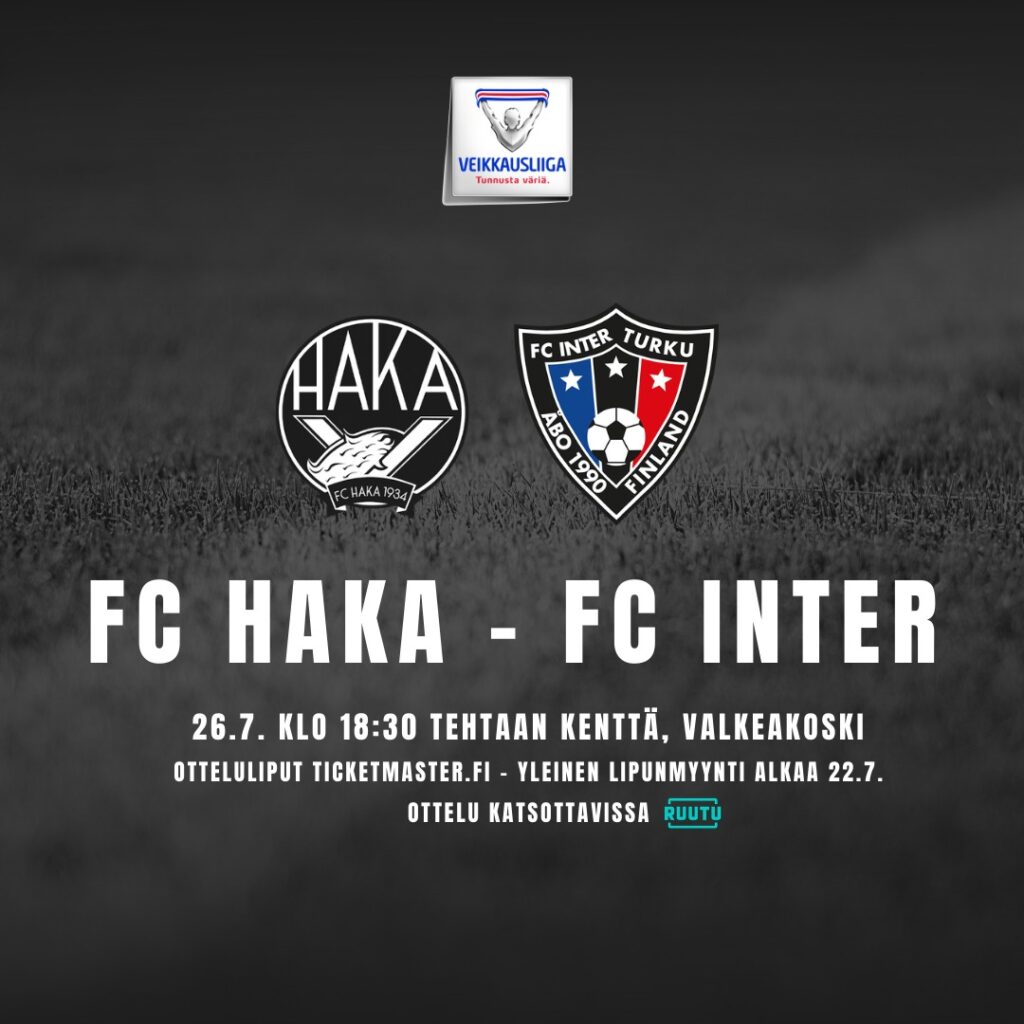 Tänään maanantaina alkoi kausikorttilaisten lipunvaraus FC Haka – FC Inter -otteluun sunnuntaina 26.7. Kausikorttilaisille on lähetetty sähköpostiin linkki, jolla pääsee varaamaan kausikorttilipun.