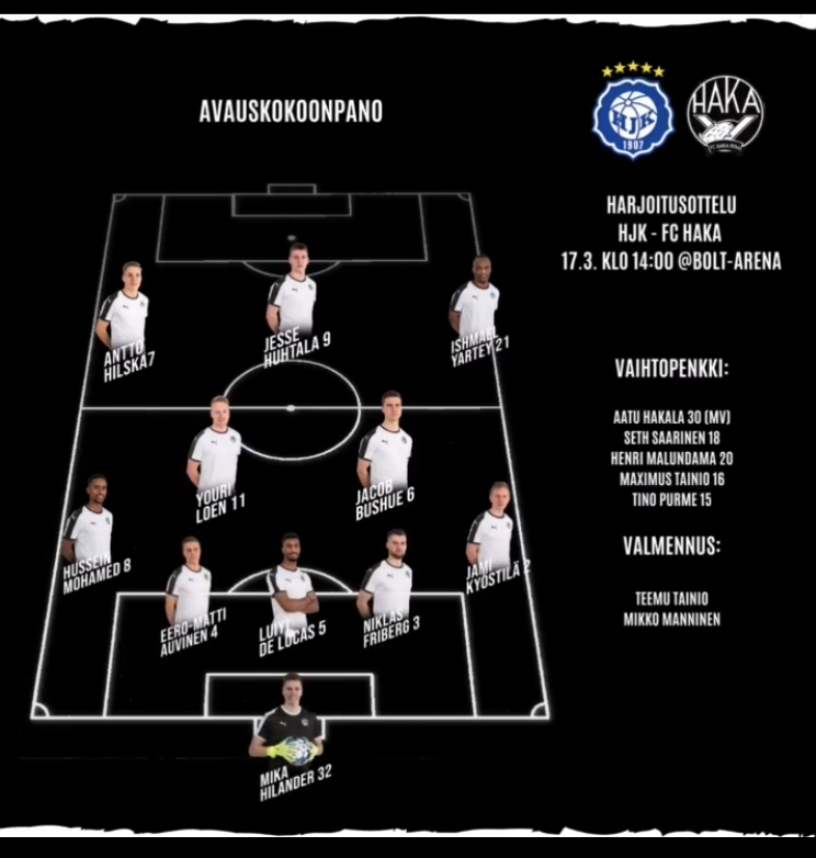 Hakallakin oli ensimmäisellä jaksolla paikkansa. Jesse Huhtala pääsi vuorostaan puskemaan pallon takatolpalta ohi HJK -maalissa pelanneen Jakob Tånnanderin, mutta tämä osuma hylättiin niin ikään paitsiona.