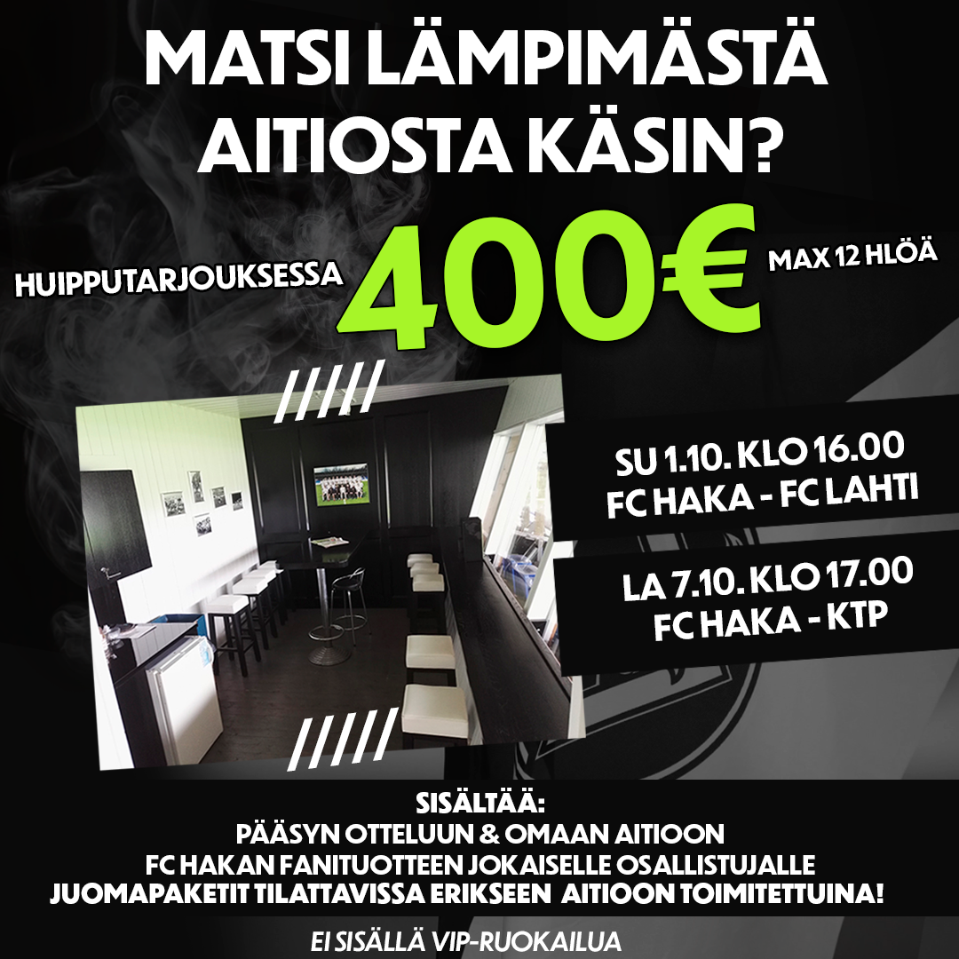 Syksy on saapunut ja Tehtiksen iltavalot syttyvät vielä kerran FC Hakan kotiotteluiden merkeissä. Karkaa viileää ilmaa pakoon lämpimään aitioon! Nyt on mahdollista varata esimerkiksi kaveriporukallesi Tehtaan kentän parhaat paikat! Tehtiksen kotikausi huipentuu otteluun FC Haka – KTP lauantaina 7.10. klo 17.00. Aition erityistarjoushinta on vain 400€/ottelu. Aitio on tarjolla max. 12 hengelle.