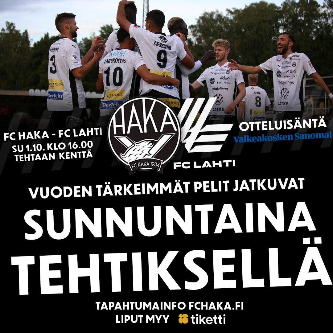 FC Haka – FC Lahti, Tehtaan kenttä, su 1.10. klo 16.00 (portit auki 14.30), liput Tiketistä.