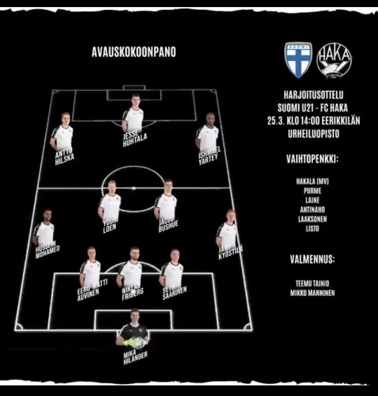 FC Haka ja Suomen U21 -maajoukkue ottivat torstai -iltapäivässä yhteen Eerikkilän tekonurmella. Tasainen ottelu päättyi lopulta maalittomaan tasapeliin. Ottelu kuitenkin täytti päävalmentaja Teemu Tainion odotukset.
