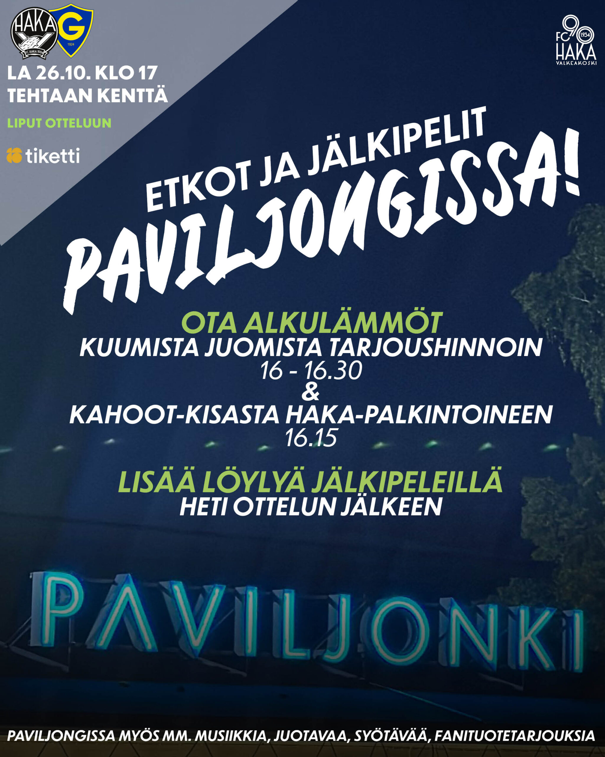 Jälkipelit vietetään totutusti ottelun jälkeen Paviljongissa, jossa FC Hakan mediavastaava Esa Heritty saa haastatteluun FC Hakan pelaajia avaamaan ottelun jälkeisiä fiiliksiä!