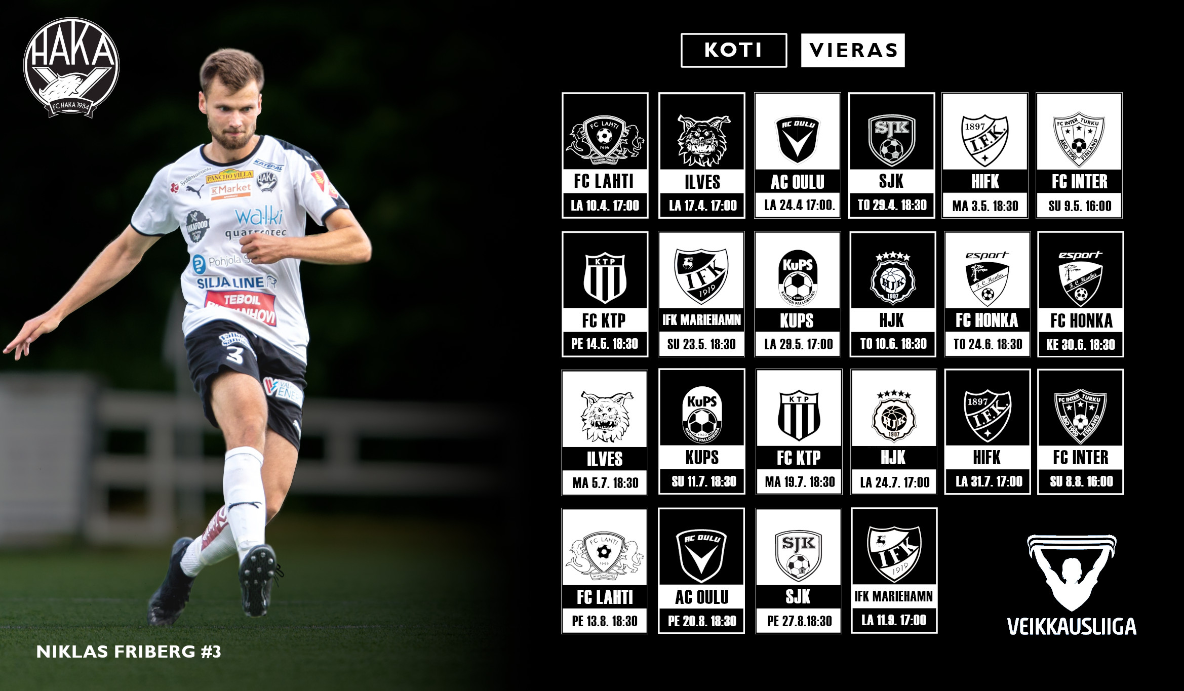 Veikkausliigan otteluohjelma kaudelle 2021 on nyt julkaistu. FC Haka pääsee avaamaan kauden kotonaan lauantaina 10. huhtikuuta, jolloin kello 17.00 alkavassa ottelussa vastaan asettuu FC Lahti.