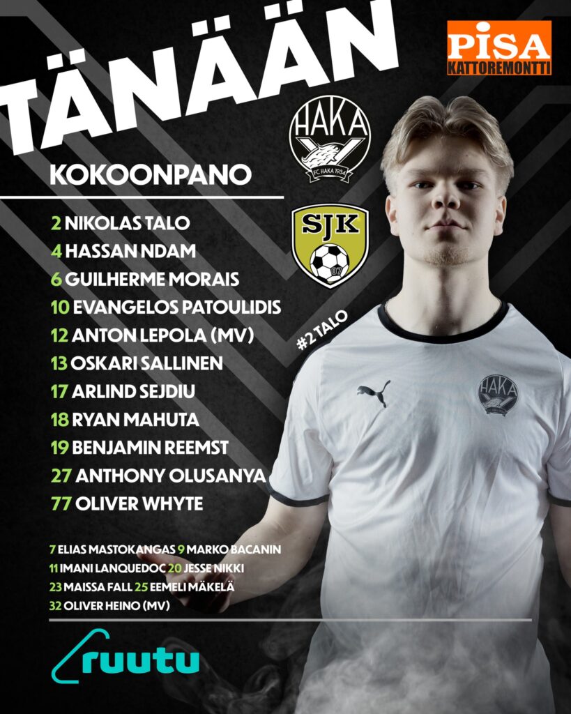 Hakallakin oli omat paikkansa ensimmäisellä jaksolla. Evangelos Patoulidis esitteli vasurinsa, mutta SJK -maalin puhtaana pitänyt Hemmo Riihimäki venytti näppinsä eteen. Aivan jakson lopuilla Haka sai luotua tilanteen, missä Anthony Olusanya sai yrittää kahdesti ja Oliver Whyte sekä Benjamin Reemst molemmat kertaalleen, mutta vuoroin Riihimäki ja SJK -puolustus olivat pallon edessä.