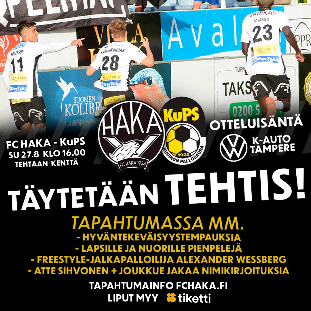 FC Haka – KuPS su 27.8. klo 16.00 (portit auki 14.30), liput Tiketistä.