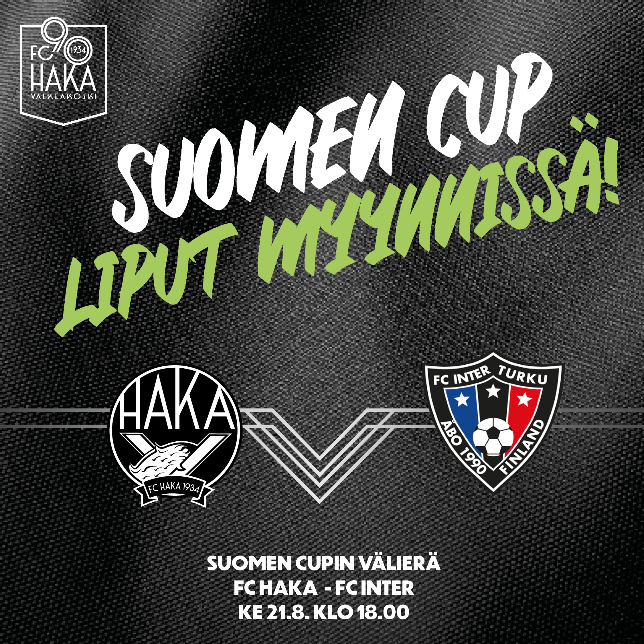 Nyt aukeaa odotettu lipunmyynti! FC Haka on vain yhden voiton päässä Suomen Cupin finaalipaikasta. Välierä FC Interiä vastaan pelataan kotona Tehtaan kentällä – tulethan mukaan kannustamaan Cup-jättiläisen, 12-kertaisen voittajan, FC Hakan voittoon ja finaaliin! Finaali pelataan Tammelan Stadionilla Tampereella 21.syyskuuta. Vastustaja selviää otteluparista SJK – KuPS, joka pelataan to 22.8.