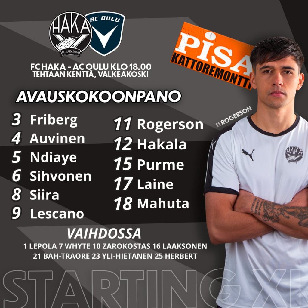 Haka oli tehnyt kauden avanneeseen SJK -otteluun verraten kaksi muutosta kokoonpanoon, kun paikkansa avauksessa ottivat Tino Purme ja Eero-Matti Auvinen, Anthony Herbertin ja Haymenn Bah-Traoren aloittaessa penkillä.
