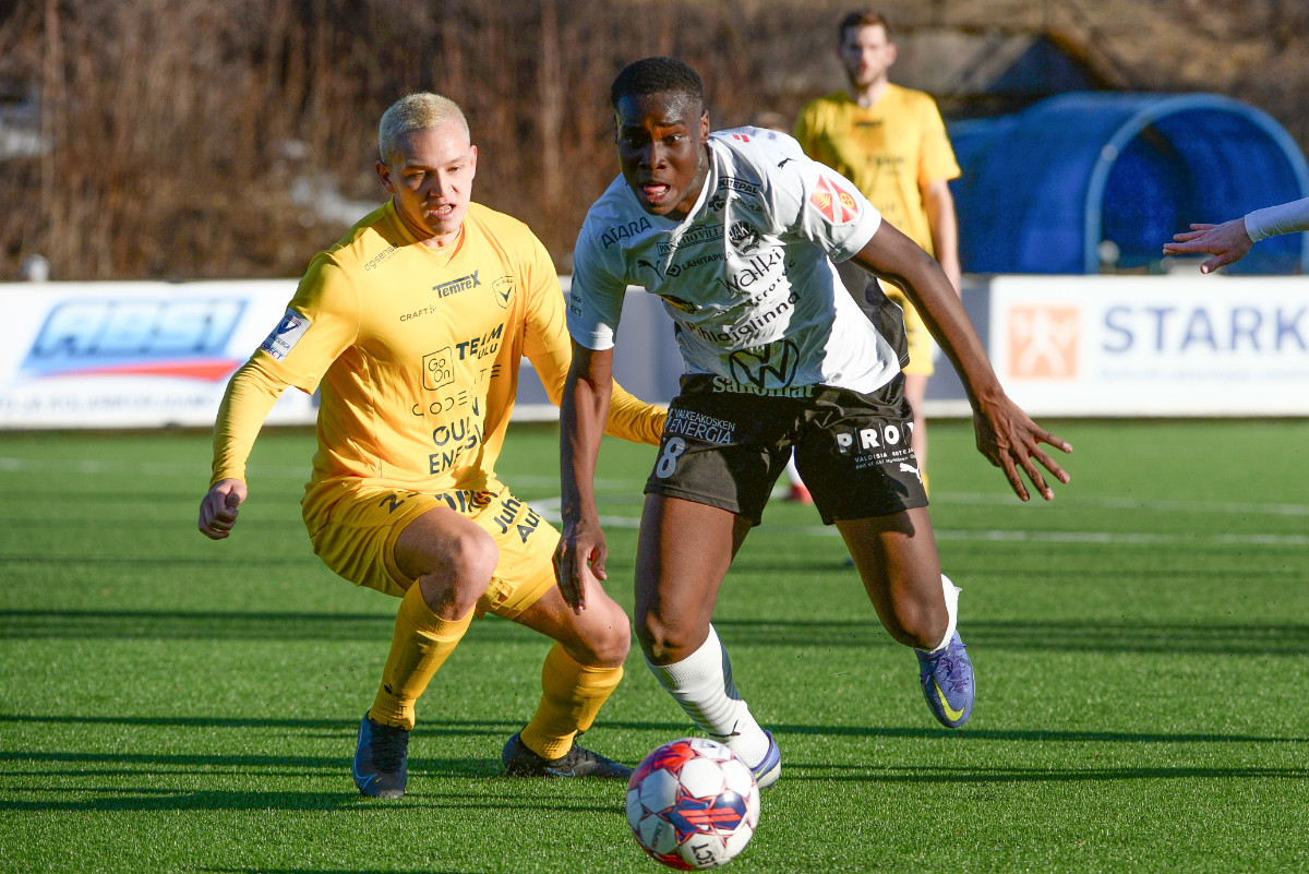 Valkopaitojen hyvä ote peliin palkittiin 14. minuutilla. Janne-Pekka Laine antoi vapaapotkun Puukatsomon puoleisen sivurajan tuntumasta eteenpäin kiertävänä kohti pilkkua, mistä lähes kaksimetrinen toppari Fallou Ndiaye pääsi päällään ohjaamaan pallon tarkasti takakulmaan.
