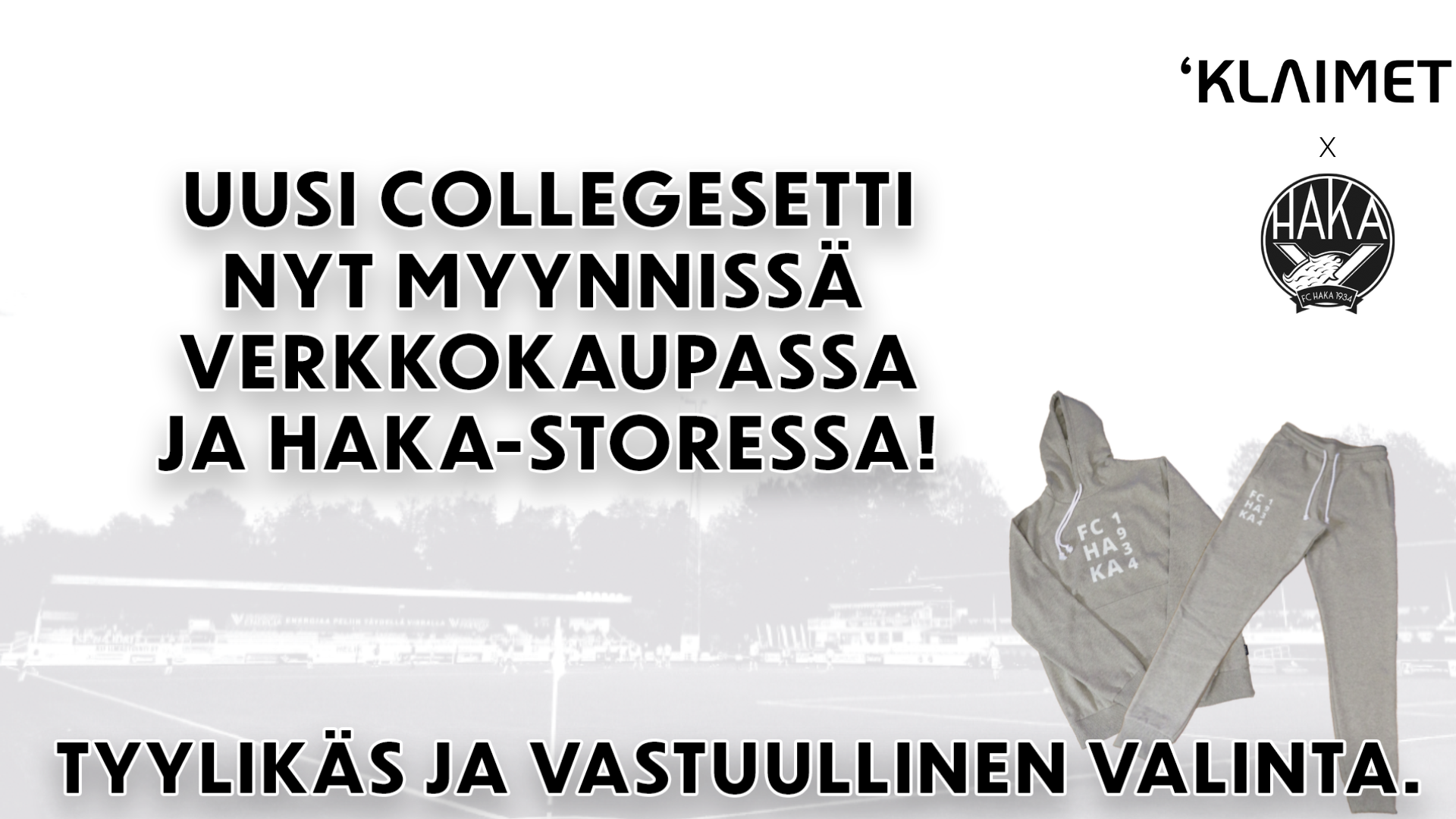 FC Haka ja vastuullinen vaatevalmistaja ‘Klaimet® ovat aloittaneet yhteistyön. Hakan fanituotevalikoimassa on nyt tarjolla tyylikäs ja vastuullinen valinta – harmaa collegesetti! Setti koostuu myös erikseen myytävistä hupparista ja collegehousuista.