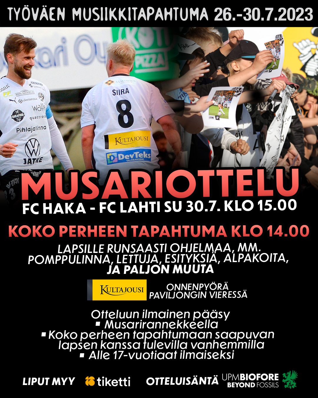 Valkeakosken yksi kesän odotetuimmista tapahtumista on Työväen Musiikkitapahtuma, jonka ohessa FC Haka on perinteisesti pelannut ”Musariottelun”. Tänä vuonna Musareiden aikaan FC Haka kohtaa FC Lahden sunnuntaina 30.7. klo 15.00. Viime vuonna Musariottelussa sunnuntaipäivän perinteinen Lasten tapahtuma saapui Tehtaan kentälle ja niin myös tänä vuonna!