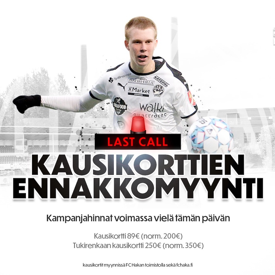 Tänään maanantaina 15.11.2021 on viimeinen mahdollisuus ostaa FC Hakan ensi Veikkausliigakauden kausikortti ja se näkyy toimistolla.