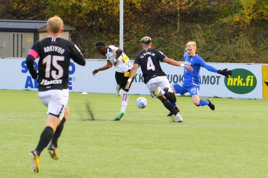 Vieraat lähtivät rakentamaan peliään puolustuksen kautta, mutta Haka -hyökkääjien kovaa prässiä seurasi harhasyöttö, minkä Donaldo Acka poimi itselleen ja vapautti Yarteyn läpiajoon. Puolustaja Riyadh El Alamin pienestä repimisestä huolimatta, ghanalainen sijoitti pallon varmasti ohi Lahden maalissa seisseen Joona Tiaisen.