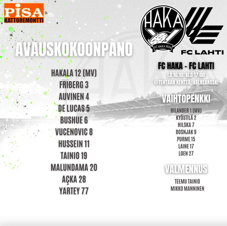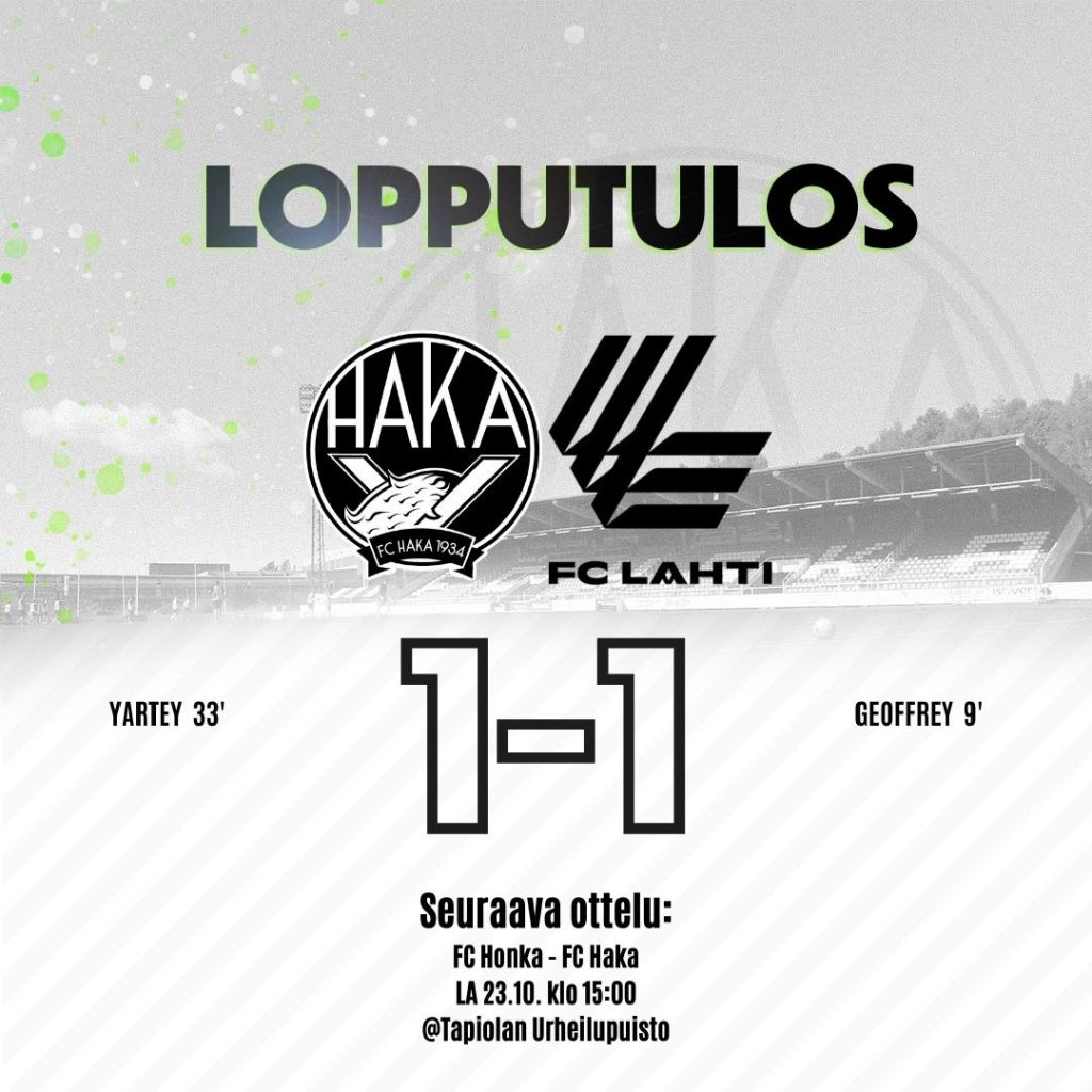 FC Haka ja FC Lahti kohtasivat lauantai -illassa Tehtaankentällä, kun Veikkausliiga palasi maaottelutauolta tositoimiin. Loukkaantumisista ja pelikielloista, sekä ilman panosta pelannut Lahti ei antanut poissaolojen haitata, vaan taisteli uhrautuvasti loppuun asti. Hämmästyttävän tasaisesti useasti pelanneet joukkueet päätyivät jälleen pistejakoon tuloksella 1-1.