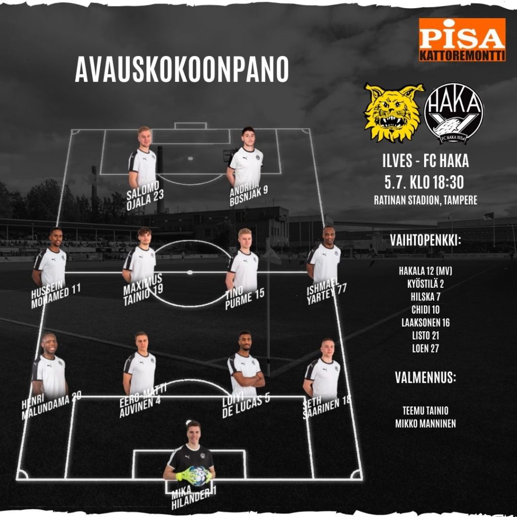 Haka lähti otteluun ilman Niklas Fribergiä, puolustajan kärsiessä pelikieltoa Honka-ottelun jäljiltä. Sen sijaan ottelussa virheellisesti Fribergin sijasta punaisen kortin saanut Eero-Matti Auvinen aloitti pelin avauskokoonpanossa, jossa Haka ryhmäytyi jälleen 4-4-2 muodossa. Myös Hussein Mohamed ja Salomo Ojala nousivat aloitukseen.