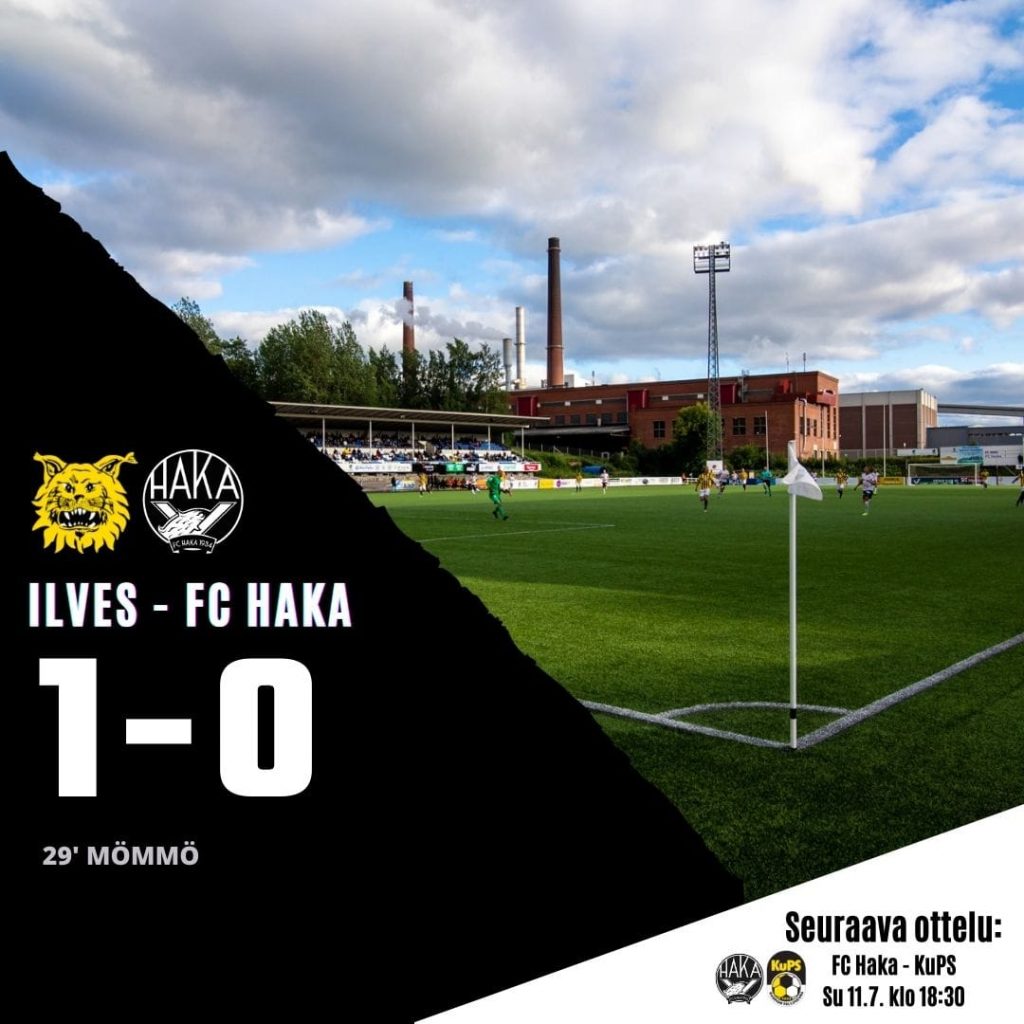 Tasaisen väännön jälkeen Ilves otti kuitenkin pelin johtoaseman 29. minuutilla, kun päättäväisen yksilösuorituksen jälkeen Eetu Mömmön laukaus osui vasempaan alakulmaan ohi Haka-pelaajien. ”Hila” ei tilanteessa laukausta ennättänyt pysäyttää ja tauolle lähdettiin Ilveksen 1-0 johdossa. Toiselle puoliajalle mentäessä Haka reagoi tappiotilanteeseen kahdella vaihdolla. Youri Loen ja Samuel Chidi korvasivat Hussein Mohamedin ja Salomo Ojalan, ja näin Haka sai keskikentän tiukkoihin vääntöihin tuoretta voimaa.
