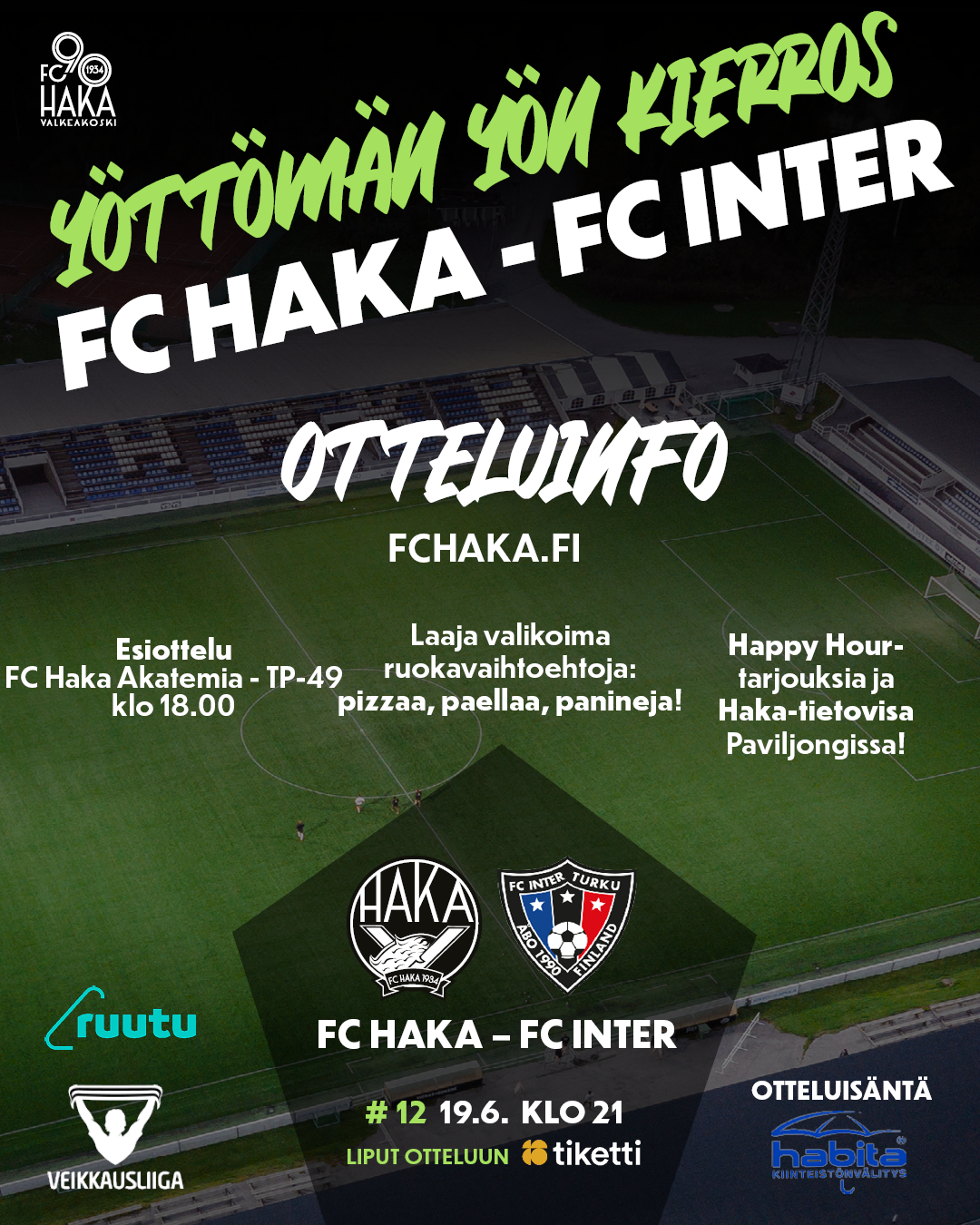FC Haka – FC Inter, Tehtaan kenttä, ke 19.6. klo 21.00, liput Tiketistä tai portilta.